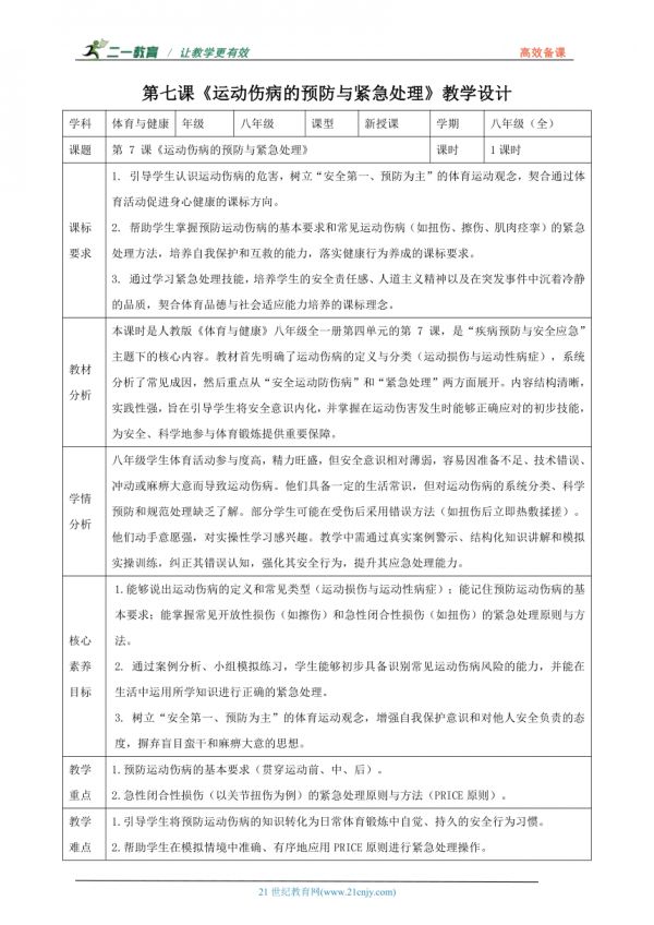 教材分析 本课时是人教版《体育与健康》八年级全一册第四单元的第 7 课,是“疾病预防与安全应急”主题下的核心内容。教材首先明确了运动伤病的定义与分类(运动损伤与运动性病症),系统分析了常见成因,然后重点从“安全运动防伤病”和“紧急处理”两方面展开。内容结构清晰,实践性强,旨在引导学生将安全意识内化,并掌握在运动伤害发生时能够正确应对的初步技能,为安全、科学地参与体育锻炼提供重要保障。
