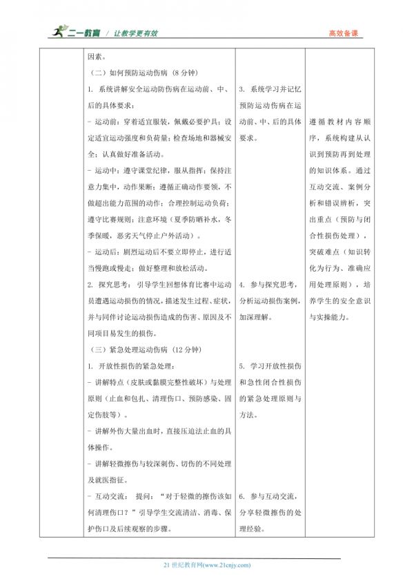 探究新知 (一)什么是运动伤病 (5分钟)1. 讲解运动伤病的定义(由运动产生的运动损伤以及运动性病症的总称)。2. 讲解分类:- 运动损伤:如擦伤、刺伤、关节扭伤等,并介绍按损伤部位分类(软组织损伤、骨损伤等)。- 运动性病症:如肌肉痉挛、运动性腹痛、运动性中暑、晕厥等。3. 分析初中生发生运动伤病的常见原因:思想重视不足、缺乏合理准备活动、技术存在不足或错误、身体功能和心理状态不良、动作粗野或违反课堂常规、场地设施、气候等外部环境。4. 互动交流: 提问:“除了这些原因,你还知道哪些因素与运动伤病的发生有关?”引导学生补充运动装备、运动负荷、整理活动等因素。(二)如何预防运动伤病 (8分钟)1. 系统讲解安全运动防伤病在运动前、中、后的具体要求:- 运动前:穿着适宜服装,佩戴必要护具;设定适宜运动强度和负荷量;检查场地和器械安全;认真做好准备活动。- 运动中:遵守课堂纪律,服从指挥;保持注意力集中,动作果断;遵循正确动作要领,不做超出能力范围的动作;合理控制运动负荷;遵守比赛规则;注意环境(夏季防晒补水,冬季保暖,恶劣天气停止户外活动)。- 运动后:剧烈运动后不要立即停止,进行适当慢跑或慢走;做好整理和放松活动。2. 探究思考: 引导学生回想体育比赛中运动员遭遇运动损伤的情况,描述发生过程、症状,并与同伴讨论运动损伤造成的伤害、原因及不同项目易发生的损伤。(三)紧急处理运动伤病 (12分钟)1. 开放性损伤的紧急处理:- 讲解特点(皮肤或黏膜完整性破坏)与处理原则(止血和包扎、清理伤口、预防感染、固定伤肢等)。- 讲解外伤大量出血时,直接压迫法止血的具体操作。- 讲解轻微擦伤与较深刺伤、切伤的不同处理及就医指征。- 互动交流: 提问:“对于轻微的擦伤该如何清理伤口?”引导学生交流清洁、消毒、保护伤口及后续观察的步骤。2. 急性闭合性损伤的紧急处理——重点:- 讲解特点(皮肤完整,软组织受伤)及急性期、恢复期概念。-根据图示讲解急性闭合性损伤的紧急处理方法。-观看科普视频,加深记忆。- 展示“小虎扭伤”案例,引导学生探究思考,找出错误之处(继续运动、热敷、揉搓)。讲解并强调正确的紧急处理原则:休息、加压、抬高,并及时就医排除严重损伤。3. 常见运动性病症的预防与处理:- 胫腓骨疲劳性骨膜炎:讲解成因、表现、处理(休息、加压、冰敷)与预防(避免突然加量、合适装备、充分拉伸)。- 肌肉痉挛:讲解成因、表现、缓解方法(缓慢持续拉伸、热敷)与预防(充分热身、保暖、补充电解质)。- 重力性休克:讲解成因、预防(剧烈运动后继续低强度活动)与处理(平卧、抬高下肢、观察生命体征)。 1. 认真听讲,识记运动伤病的定义、分类及常见原因。2. 参与互动交流,补充运动伤病相关因素。3. 系统学习并记忆预防运动伤病在运动前、中、后的具体要求。4. 参与探究思考,分析运动损伤案例,加深理解。5. 学习开放性损伤和急性闭合性损伤的紧急处理原则与方法。6. 参与互动交流,分享轻微擦伤的处理经验。7. 分析“小虎”案例,辨识错误,掌握正确处理方法(休息、加压、抬高)。8. 了解常见运动性病症的基本预防与处理措施。 遵循教材内容顺序,系统构建从认识到预防再到处理的知识体系。通过互动交流、案例分析和错误辨析,突出重点(预防与闭合性损伤处理),突破难点(知识转化为行为、准确应用处理原则),培养学生的安全意识与实操能力。