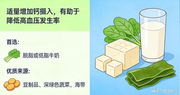 高钙:适量增加钙摄入,有助于降低高血压发生率。脱脂或低脂牛奶是首选,豆制品、深绿色蔬菜、海带等也是优质来源。