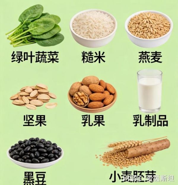 高镁:镁能扩张动脉血管,降低血压。绿叶蔬菜是镁的最佳来源,糙米、燕麦、坚果、乳制品、黑豆、小麦胚芽等含量也很丰富。