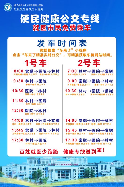 2.为便捷健康专线往返“林村公寓西门→医院”“林村公寓西门→医院→万科棠樾3号门”,林村、万科棠樾至医院沿途乘客只上不下;医院至林村、万科棠樾沿途乘客只下不上,医院站作为终点站,其中塘厦镇社区卫生服务中心站可以上落。