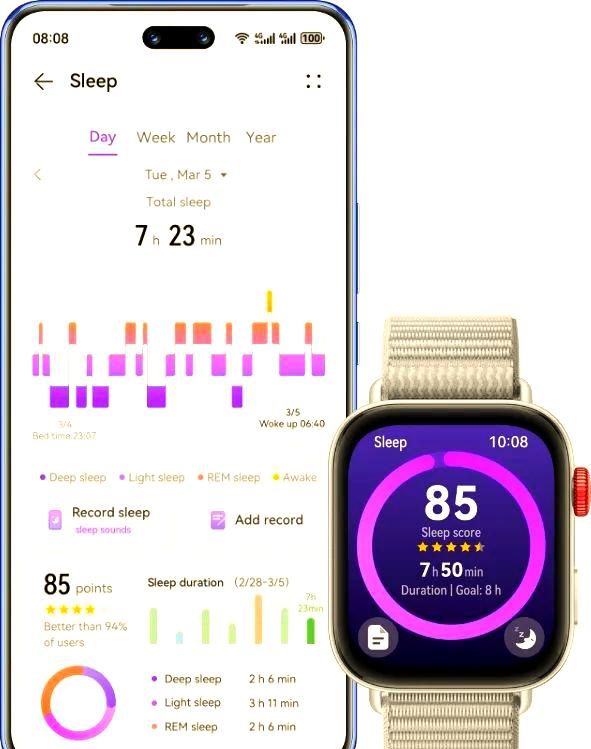 华为的TruSleep 4.0系统在睡眠监测方面带来了革命性的“高级科学睡眠增强”功能,相较于前代产品Watch Fit 2,它提供了更为全面和细致的睡眠追踪解决方案。该系统不仅能深入检测和分析用户的睡眠活动、习惯和模式,还能据此为用户提供一个全面且客观的睡眠质量评分。这个评分依据的是行业内公认的高标准,旨在帮助用户更深入地洞察自己的睡眠状况,从而做出更科学的睡眠管理决策。