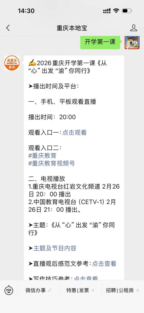 温馨提示:微信搜索公众号【重庆本地宝】,关注后在对话框回复【第一课】可获2026开学第一课《从“心”出发 “渝”你同行》直播时间,完整视频回放入口(手机+电脑),节目内容、观后感范文+写作技巧。