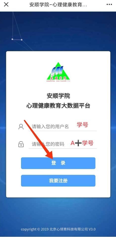 第一步:登录心理健康大数据平台,输入用户名和密码,点击登录,用户名为学号,密码为A+学号。