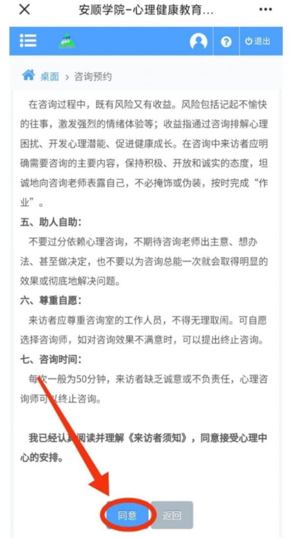 第四步:阅读《来访者须知》。认真阅读并理解后,点击“同意”。