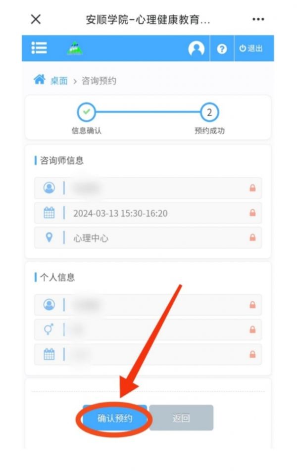 第六步:核对预约信息。请您认真核对咨询师、咨询时间和个人信息后,点击“确认预约”。