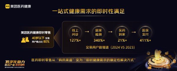 一方面,即时零售服务外延不断扩大,30分钟送药到家延伸至30秒线上接诊咨询、3小时出结果的居家快检服务以及即买即得的线上医保支付服务。活动现场,王丹分享了一组数据,2024年美团医药健康线上问诊咨询交易用户数同比增长127%,居家快检及线上医保支付服务同比增速分别达到340%和411%,一站式在线健康服务的渗透率得到显著提升。