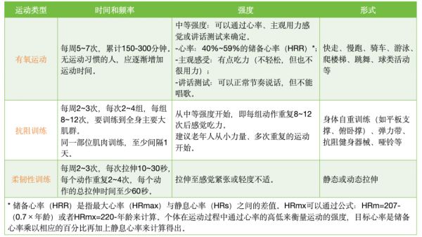 中等强度有氧运动每周至少150分钟。提倡结合多种形式的抗阻训练并辅以柔韧性训练。