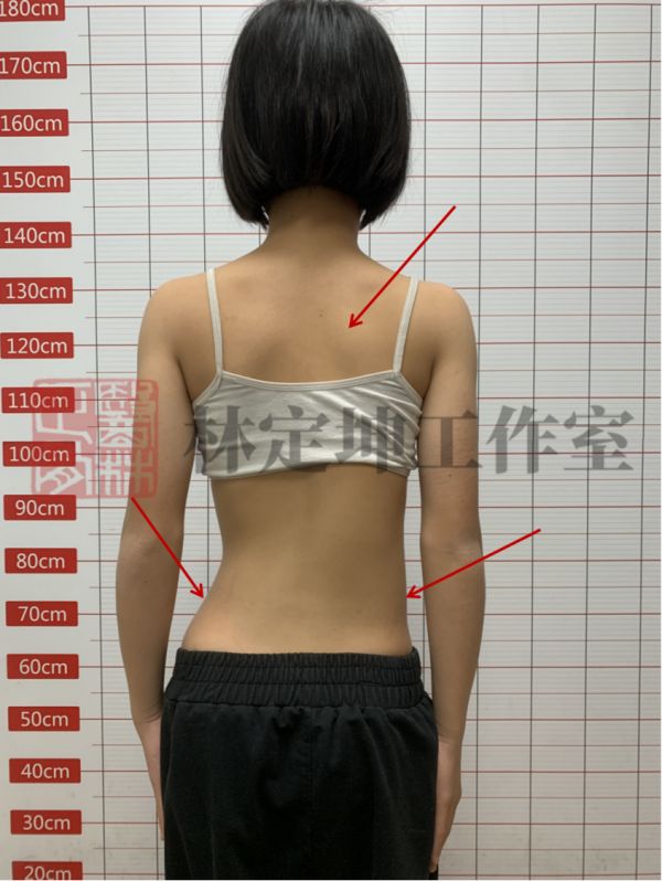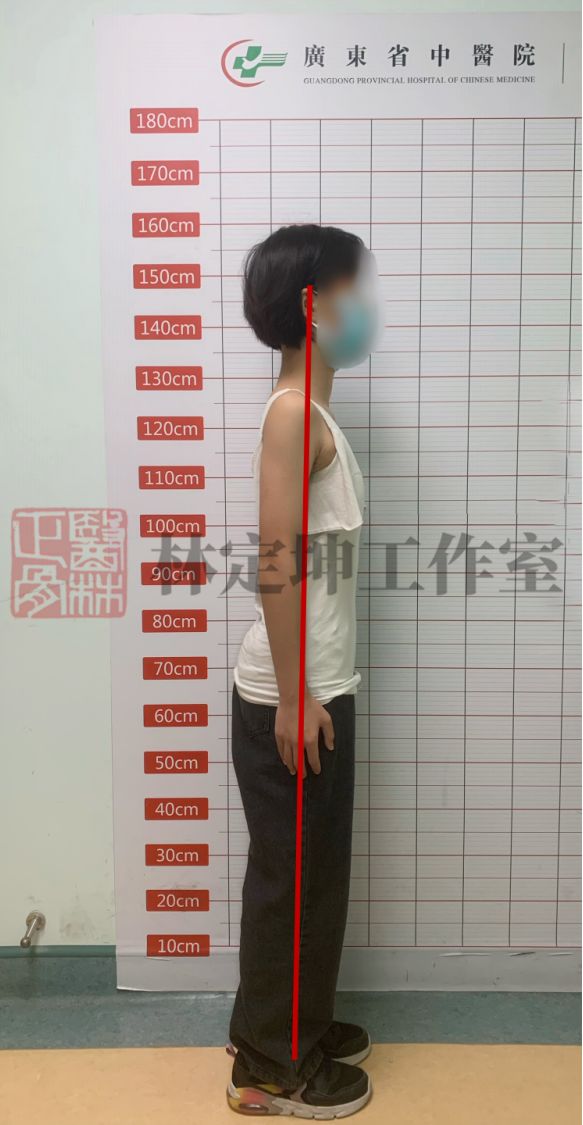 耳朵垂线:从侧面拍照,做一经耳垂的垂线,线条是否经过下肢股骨大转子、踝关节;如不经过,则存在脊柱侧弯的可能。