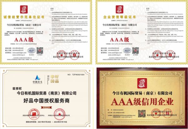 今日有机国际贸易有限公司成立于2019年,它是一家以有机商品为核心,集国内有机商品销售与国外有机商品进出口为一体的综合性贸易公司。公司发展至今已拥有合作供应商近五百家,客户遍布全国及海外地区,还荣获了“好品中国”授权服务商、AAA级信用企业、AAA级重质量守信用企业、诚信示范经营认证企业、消费者信赖品牌等一系列资质荣誉称号。同时,公司还于2020年上线了“今日有机”app,该平台所销售的商品通过了中国、欧盟、美国、日本等多个国家有机机构认证。