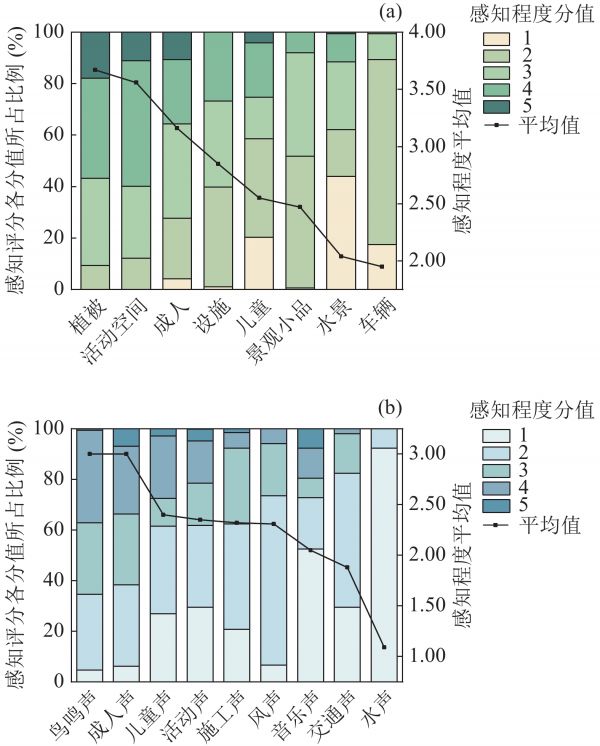 图 2 老年人对社区开放空间视听元素的感知 (a)视觉元素; (b)声源