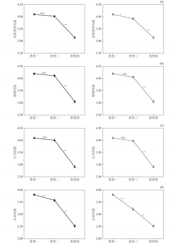 图 5 不同场地类型恢复性差异(n.s: 无显著差异, **: p < 0.01, ***: p < 0.001) (a) 总恢复性; (b) 情绪; (c) 行为; (d) 认知