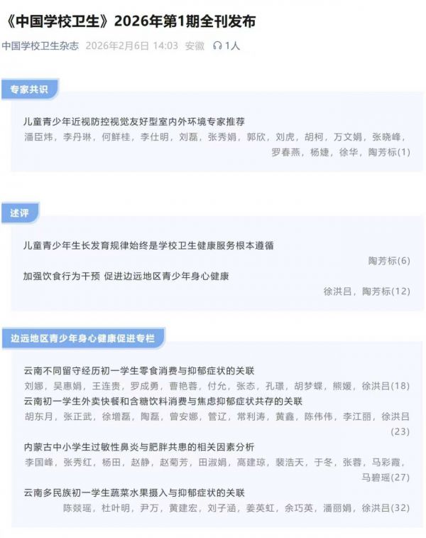 这些成果对云南边远地区学校开展健康促进、心理健康教育及改善学生饮食与心理状况具有重要指导意义。值得一提的是,这是徐洪吕教授第二次受邀为该刊组织重点号专栏。系列研究成果为云南边疆地区学校健康教育和学生身心健康促进提供了科学依据与实践参考,充分体现了昆明学院医学院社区护理研究团队在边远地区青少年健康领域的科研实力与持续深耕。(作者:胡东月)