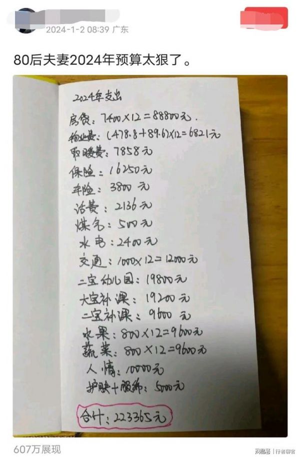 而对于一个家庭来说,也一样有必要做好支出预算,才知道今年要赚多少钱回来支撑这个家的全年开支,特别是有小孩的家庭,更是每天早上睁开眼就意味着口袋里的钞票要开始往外掏,于是有一个80后的二胎家庭在1月2日晒出了自家2024年的新年支出预算,金额高达22.33万元。