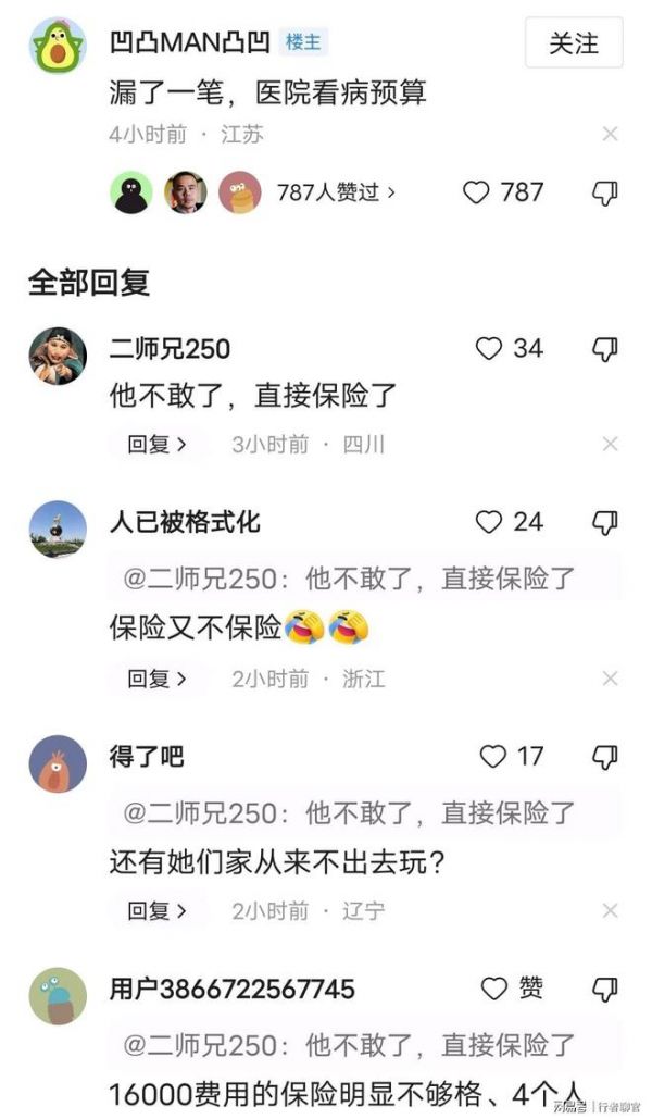 但却还有网友表示,这个支出预算还漏了一项可能是最大的支出——看病预算,看病预算这个金额确实不好预计,要是得场大病那就是无底洞。