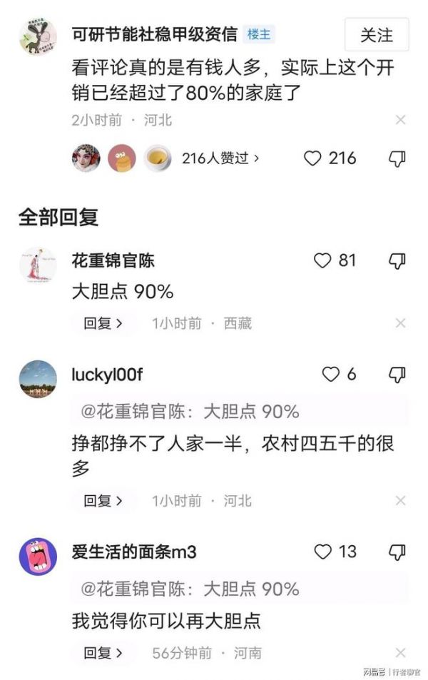 这个80后二胎家庭一年22.33万的支出预算确实应该是超过了绝大多数家庭,毕竟如今不要说是支出,就光是年收入能达到20开万的都还是少数,所以有网友说这个支出金额超过了90%的家庭,也并不是危言损听。
