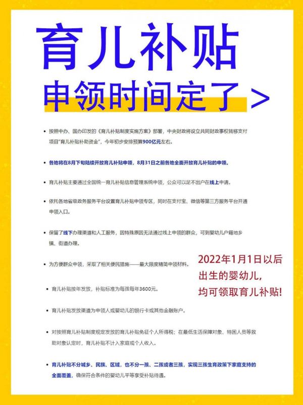 2025年1月1日起,根据财政部等部门联合发布的《育儿补贴制度实施方案》,全国范围内开始实施普惠式育儿补贴。这项政策不分城乡、区域、收入,也不区分一孩、二孩、三孩,每孩每年可获得3600元补贴,直至年满3周岁。
