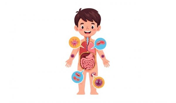 儿童男孩健康细菌疾病感染免疫力医学保健儿科卡通友好微生物生物学解剖学教育学校学习媒介插图设计隔离白色意识预防诊所
