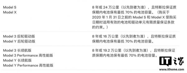 IT之家注意到,根据特斯拉中国的规定,Model 3 / Model Y 在 8 年或 16 万公里内、Model 3 长续航 / 3P 及 Model Y 长续航 / YP 在 8 年或 19.2 万公里内、Model S / X 在 8 年或 24 万公里内,如果电池衰减超过 30%,且损坏原因“不是人为造成的”,可以申请免费更换电池。