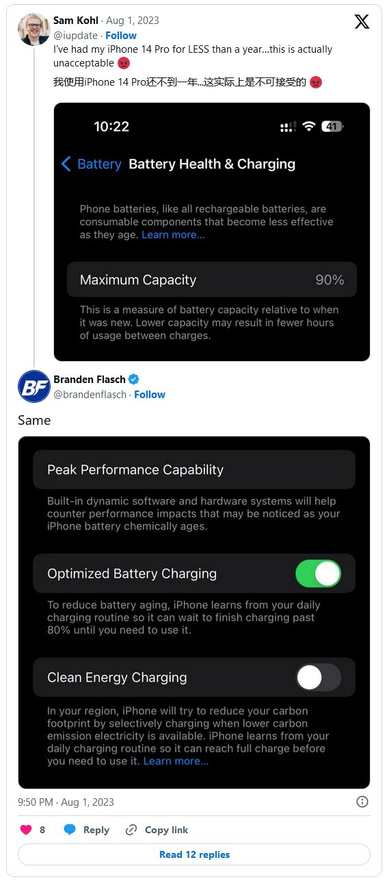 查询了 Twitter 和 Reddit 社区,不少 iPhone 14 系列用户留言反馈称,不到 11 个月,iPhone 14 系列电池健康度已经低于 90%,另一位用户反馈健康度已跌至 87%。
