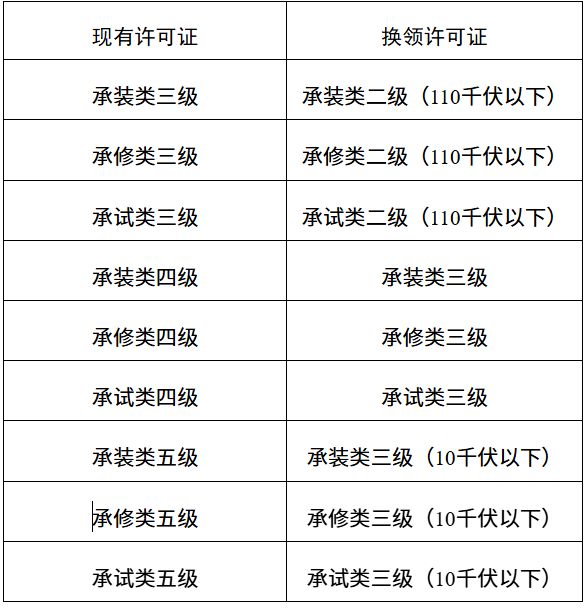 承装(修、试)电力设施许可证换领对照表