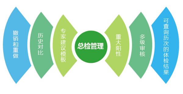 具有强大的总检功能,丰富的专家建议模板、能够自动产生综述和建议,可以方便地查询历次的体检结果,可以进行必要的对比分析,具有完备的总检撤销和重做功能,在总检未撤销前,阻止体检明细项目结果值的随意修改;支持初审、终审多级别审核权限管理。