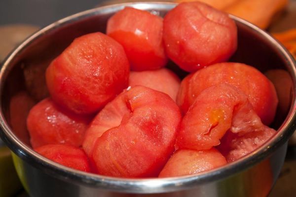 将番茄彻底清洗后,在其表面划上十字。准备一锅约60度的热水,将处理好的番茄放入,盖上锅盖焖煮两分钟,直至番茄皮自然脱落。使用筷子剥去番茄皮,通过热水烫制去皮后,将番茄切块以便进一步处理。