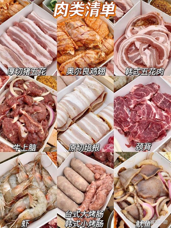 牛肉、猪肉、羊肉、培根、韩式小烤肠/大烤肠、翅中、虾、鱿鱼、肥肠、花甲。
