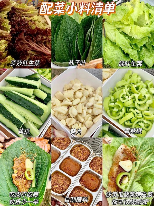 生菜啥的绿叶菜,看自己喜欢吃啥准备啥,然后黄瓜条,蒜片,辣白菜也是必不可少的。