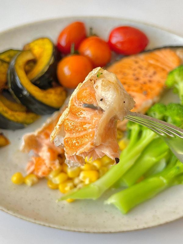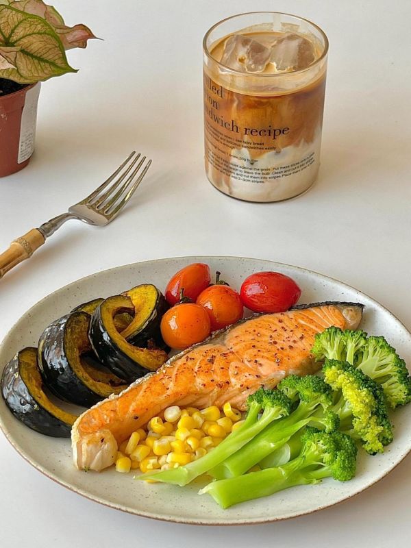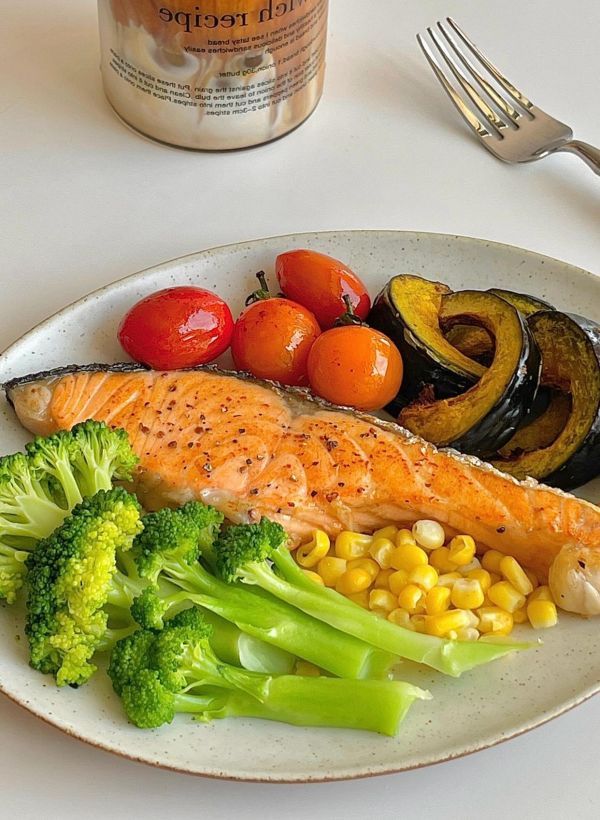 装盘:将拌好的时蔬沙拉放在盘子底部,再将煎好的三文鱼放在沙拉上,一道美味的香煎三文鱼配时蔬沙拉就完成了。