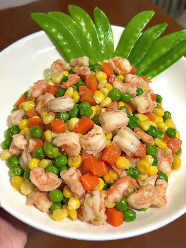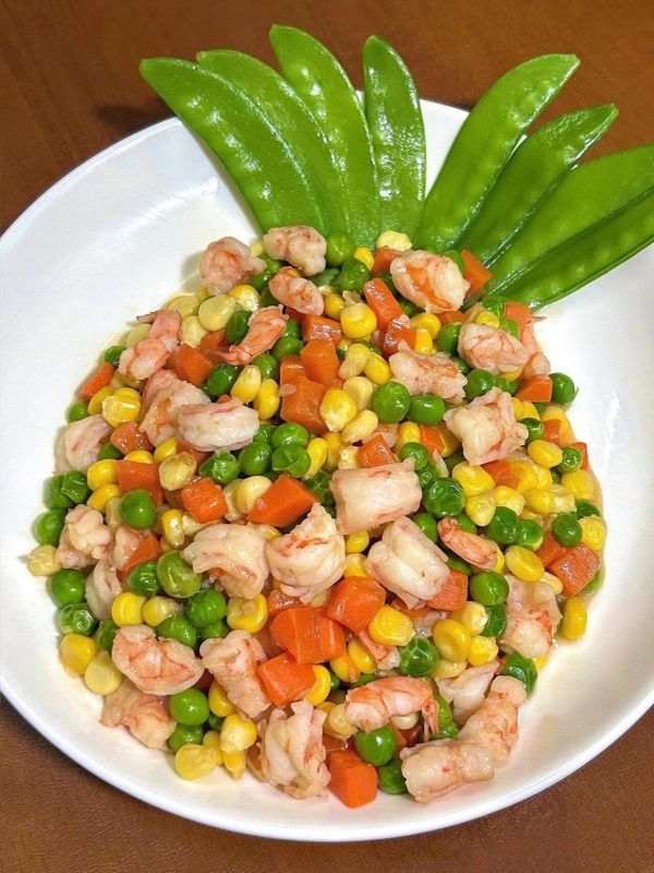 炒制虾仁和蔬菜:锅中再加入少许橄榄油,放入腌制好的虾仁翻炒至变色,接着加入胡萝卜丁、豌豆和玉米粒继续翻炒均匀。