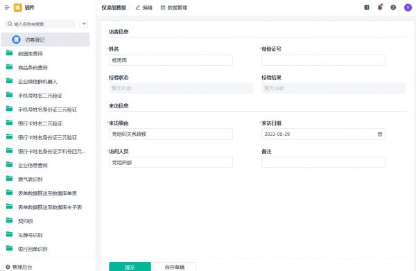 实名验证类插件,能够广泛应用于需要实名验证的场景中。如访客登记表、员工入职登记表、收货信息填写、客户档案填写等。