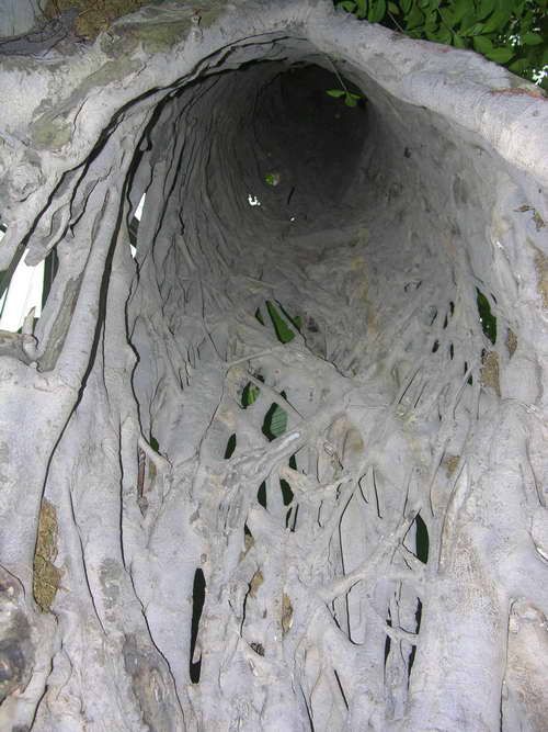 洞天树来自云南西双版纳傣族乡村,是细叶榕(Ficus microcarpus Linn.f.)完成绞杀后展现的艺术奇观。洞天树“茎”中空,空心“茎”高约10m,直径近1m,“茎”内可容纳1人,是细叶榕的种子通过鸟类粪便或者被风刮到树上后在适宜的条件下萌发,生根发芽,与所附生的大树和平共处、贮存力量;随着岁月流失气生根逐步伸到地面并形成强大的支撑根系,获得自身的支撑和丰富的营养,变得更加强大;随着不定根不断增多、分枝融合,形成强大的木质根网系统,团团围绞中间的大树;中间的大树因生活空间限制和营养不良而逐渐枯萎逝去,细叶榕则取而代之成为一株独立的参天大树,最后形成由榕树网状根组成的空心树身。(洞天树景观位于华南植物园的热带雨林温室)