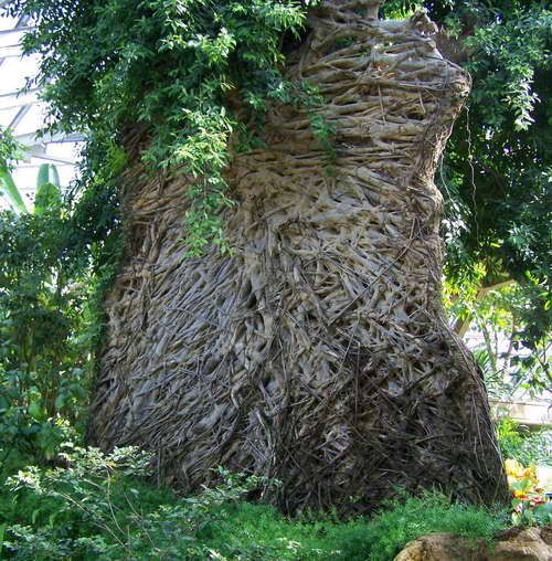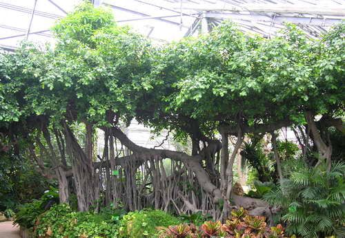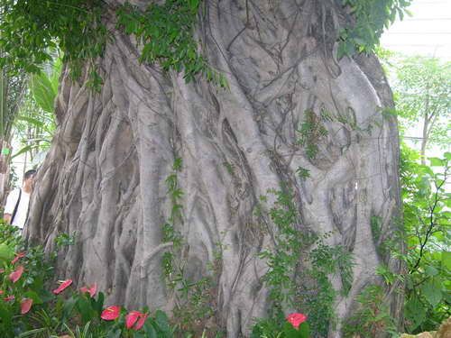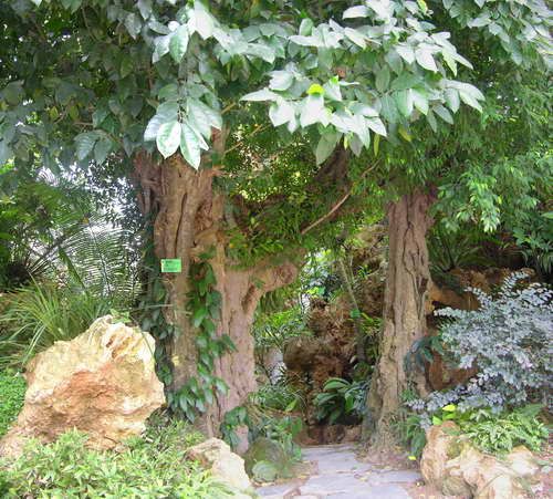 自然界唯有榕树能“独木成林”。榕环(Ficus annulata)枝条上生长的气生根向下伸入土壤形成新的树干称之为“支柱根”,有些支柱根又能长出新的枝叶成为一株新的环榕树。环榕树高达30米,可向四面无限伸展,其支柱根和枝干交织在一起,柱根相连,柱枝相托,枝叶扩展,郁郁葱葱,形似稠密的丛林,形成遮天蔽日、独木成林的奇观。(独木成林景观位于华南植物园的棕榈园、雨林温室等地)