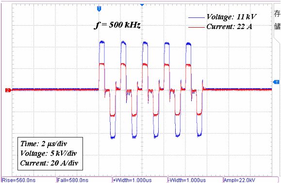 团队研制了脉冲电源样机并进行了详尽测试。该发生器可输出 0-±11 kV 可调电压,脉宽 100-500 ns 可调,爆发频率达 500 kHz,在电阻负载下的电能效率达 94.85%。