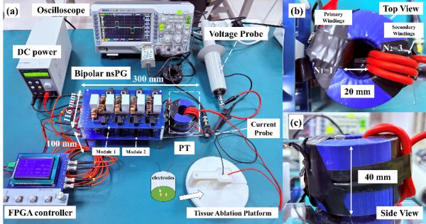 近日,中国科学院苏州生物医学工程技术研究所(以下简称“苏州医工所”)生物电课题组在纳秒脉冲电场消融(nsPFA)技术领域取得重要进展。团队提出了一种模块化、本质安全型的高频双极纳秒脉冲发生器拓扑架构,有效解决了复杂动态生物负载下的能量稳定投送与系统安全性难题。