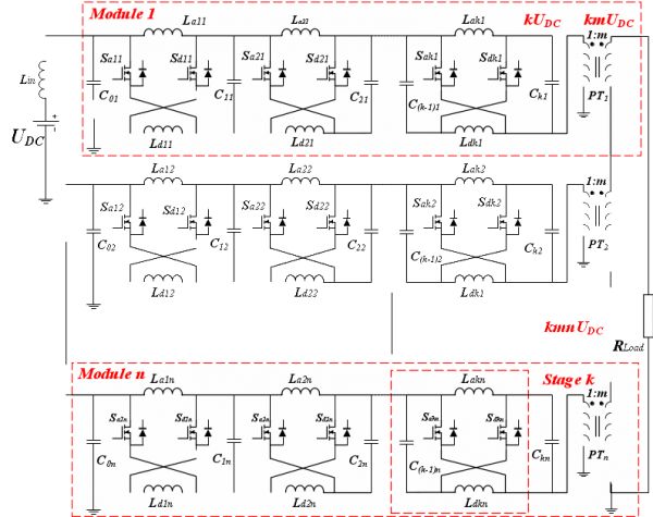 针对上述痛点,团队并未简单堆砌现有技术,而是提出了一种协同优化的混合拓扑架构(如图1所示)。该方案创造性地将双极固态Marx发生器与升压脉冲变压器(PT)相结合,构建了一个可扩展的感性电压叠加平台。