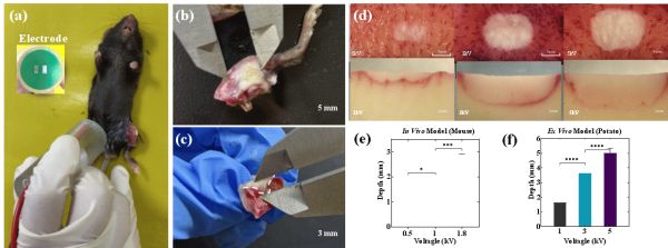 为验证设备在真实生物环境下的鲁棒性,团队开展了离体(马铃薯)和活体(小鼠)消融实验。在离体实验中,即使面对组织阻抗从 2.488 kΩ 骤降至 491 Ω(降幅超80%) 的极端工况,设备依然稳定运行。在活体小鼠实验中,面对组织快速的动态阻抗变化,发生器仍能保持输出波形的平顶特性和纳秒级边沿,电压幅值偏差小于 6.25%。实验成功在小鼠腿部肌肉制造了清晰的消融损伤,且全过程未引起明显的肌肉收缩。