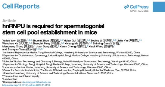2024年4月15日,华中科技大学同济医学院生殖健康研究所袁水桥教授团队在Cell杂志子刊Cell Reports上在线发表了题为“hnRNPU is required for spermatogonial stem cell pool establishment in mice”的研究成果。该研究发现核不均一核糖核蛋白hnRNPU是调控SSC池和维持男性生育力的关键因子,其缺失将导致SCOS。单细胞测序揭示hnRNPU在ProSG到SSC转变中有重要调控作用,并发现hnRNPU可调控ProSG中细胞周期相关基因的可变剪接,进而调控ProSG的迁移和分化。