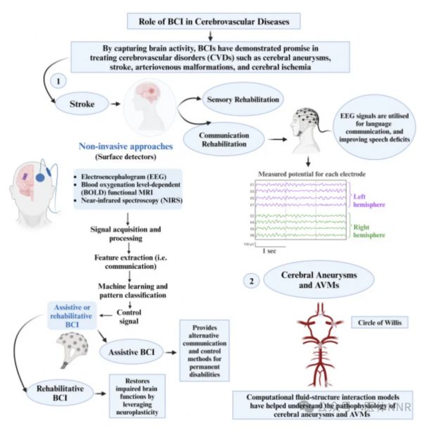 将BCI纳入CVD管理,尤其是脑动脉瘤和AVM,展示了其彻底改变手术计划、增强诊断成像和促进个性化治疗策略的潜力。这篇综合评论融合了最近研究的证据,揭示了BCI在神经外科应用的不断发展前景。图1描绘了BCI技术在脑血管保健中的整合,展示了其在中风后康复以及深入了解脑动脉瘤和AVM机制方面的能力。