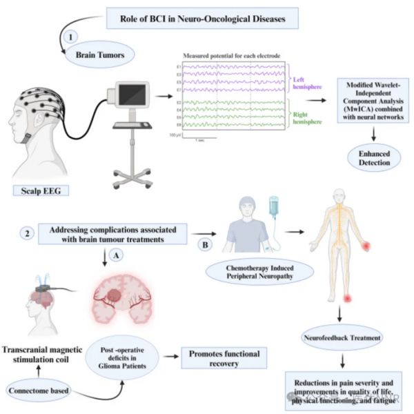 图3.示意图重点介绍了脑机接口在神经肿瘤治疗中的作用,从基于脑电图(EEG)的肿瘤检测到治疗相关神经病变和术后功能恢复的神经反馈疗法。