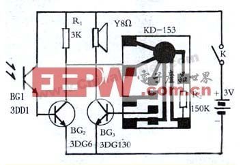 一、制作材料 1/8碳膜电阻3K、150K各1只,KD一153音乐集成片1片,光敏三极管3DD1只,三极管3DG6、3DG130各1只,8Ω扬声器1只,开关1只,2节干电池连电池夹。 二、制作方法 在一块......