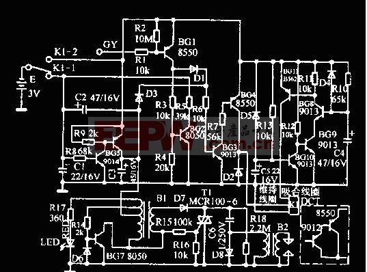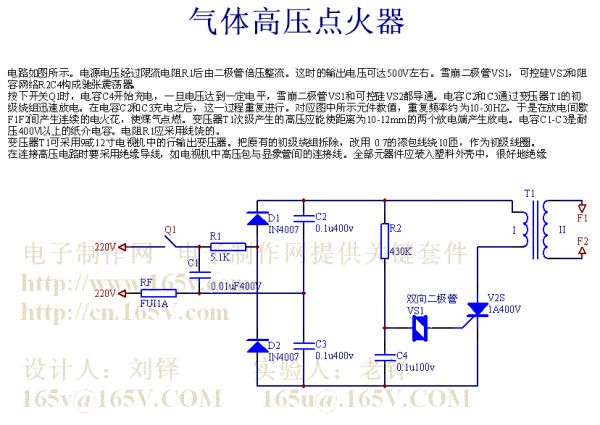 电源电压经过限流电阻R1后由二极管倍压整流。这时的输出电压可达500V左右。雪崩二极管VS1,可控硅VS2和阻容网络R2C4构成驰张震荡器。 按下开关Q1时,电容C4开始充电,一旦电压达到一定电平,雪崩二极管VS1和可控......