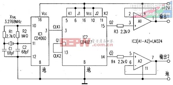 这是一种用晶体产生50Hz频率的简单振荡器电路.它输出占空比为50%的方脉冲.这种方脉冲在逆变器和精确时钟显示器中用得较多。振荡器由14级计数器兼振荡器芯片CD4060、双J―K触发器CD4027、运算放大器LM324......