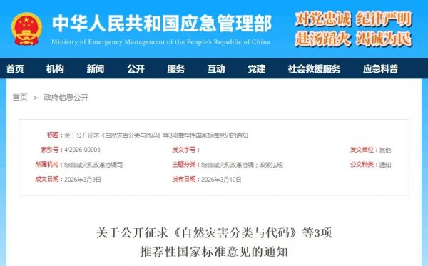 根据国家标准制修订计划安排,我们组织有关单位起草了《自然灾害分类与代码》等3项推荐性国家标准的征求意见稿,现公开征求意见。反馈意见请填写《应急管理标准项目征求意见表》,并于2026年5月11日之前发送至邮箱18611914871@163.com。
