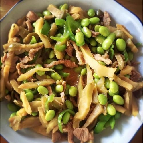 炒制要点:锅中倒入少许植物油,约5ml即可。待油温升至6成热时,放入蒜末和姜丝进行爆香。紧接着,加入榨菜丝并快速翻炒30秒,让榨菜的香气充分释放。随后,放入焯好且过凉的毛豆,大火快炒1分钟,让毛豆的鲜美与榨菜的咸香完美融合。最后,适量撒入白胡椒粉提香,少许盐调味,翻炒均匀后即可收汁装盘。