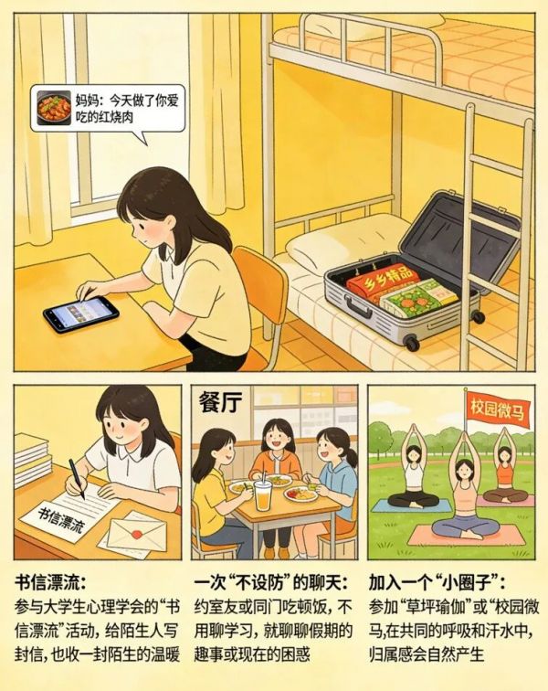 一次“不设防”的聊天:约室友或同门吃顿饭,不用聊学习,就聊聊假期的趣事或现在的困惑。哪怕只是吐槽,也是一种连接。