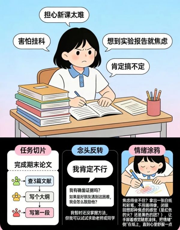 你的状态:担心新课太难、害怕挂科、想到实验报告就焦虑、觉得自己“肯定搞不定”。