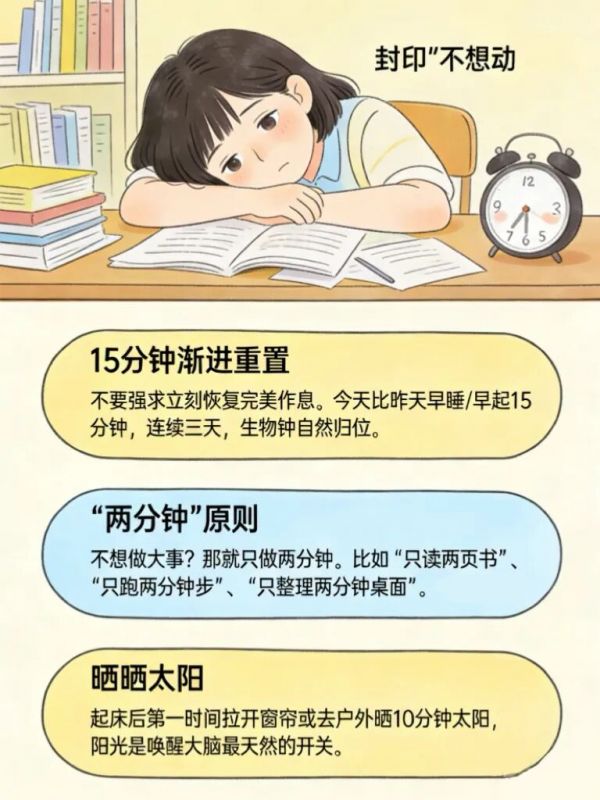 15分钟渐进重置:不要强求立刻恢复完美作息。今天比昨天早睡/早起15分钟,连续三天,生物钟自然归位。