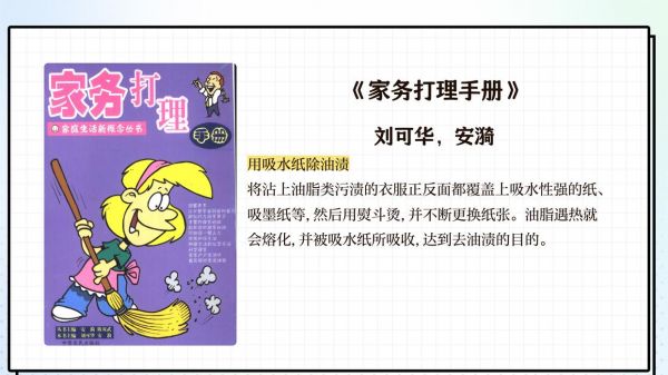 《家务打理手册》推荐冷冻溶解法:将冷冻室取出冰块包裹衣物静置15分钟使油脂凝固,再用酒精棉片从外向内螺旋式擦拭。